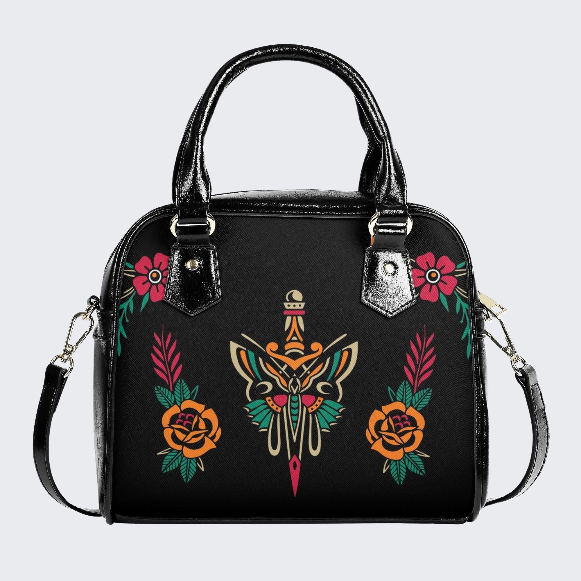 Sword And Moth Print - Leather Shoulder HandbagSword And Moth Print - Leather Shoulder Handbag